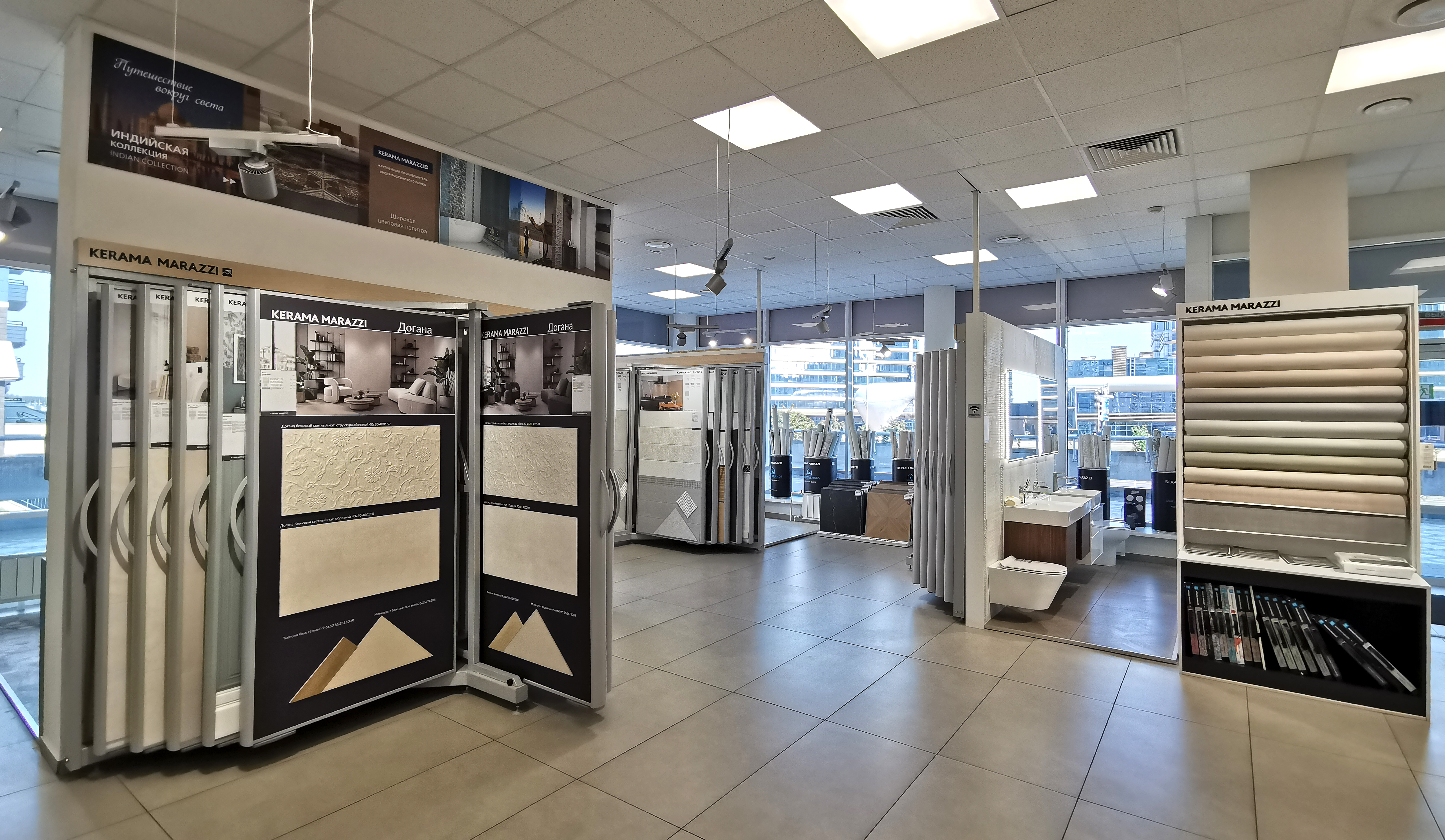 20 коллекций напольной плитки уложены в горизонтальной поверхности, что помогает увидеть, как плитка будет смотреться на полу под освещением. Каждая коллекция — это путешествие в мир искусства и культуры разных стран.