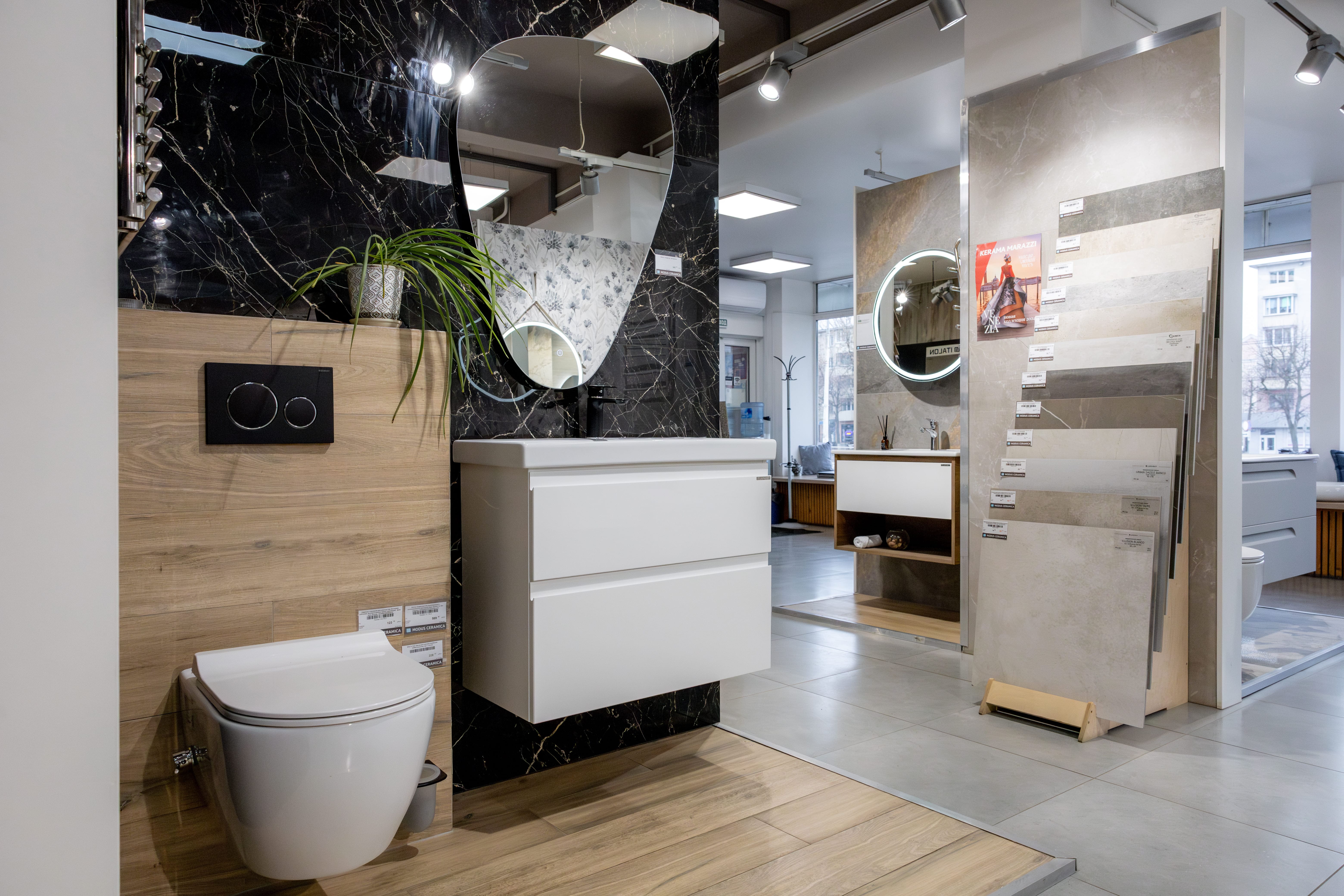 Салон включает 14 боксов, представляющих интерьерные кабины с самыми популярными сочетаниями плитки и сантехники. Это позволяет вам увидеть продукцию в реальном пространстве и выбрать идеальное решение для вашего интерьера.